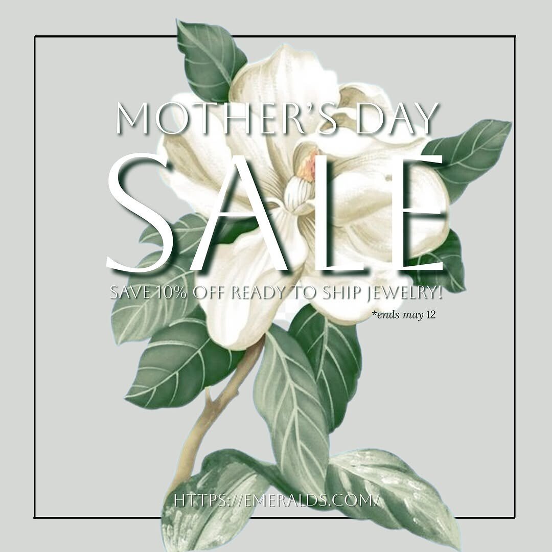 Delicate white flower shines brightly. Green leaves frame it well. This image cleverly connects nature with a special celebration—Mother's Day. Flowers symbolize love and appreciation, making them perfect for this occasion. Prominent text highlights a 10% discount on ready-to-ship jewelry. It encourages quick decisions. Urgency is built in with a clear deadline: sale ends May 12.