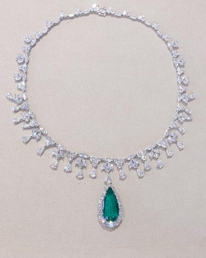 Elegant necklace shines brightly. Intricate diamonds sparkle. They create a beautiful pattern. At the center, a teardrop emerald pendant stands out. Surrounded by a halo of smaller diamonds, it draws attention.