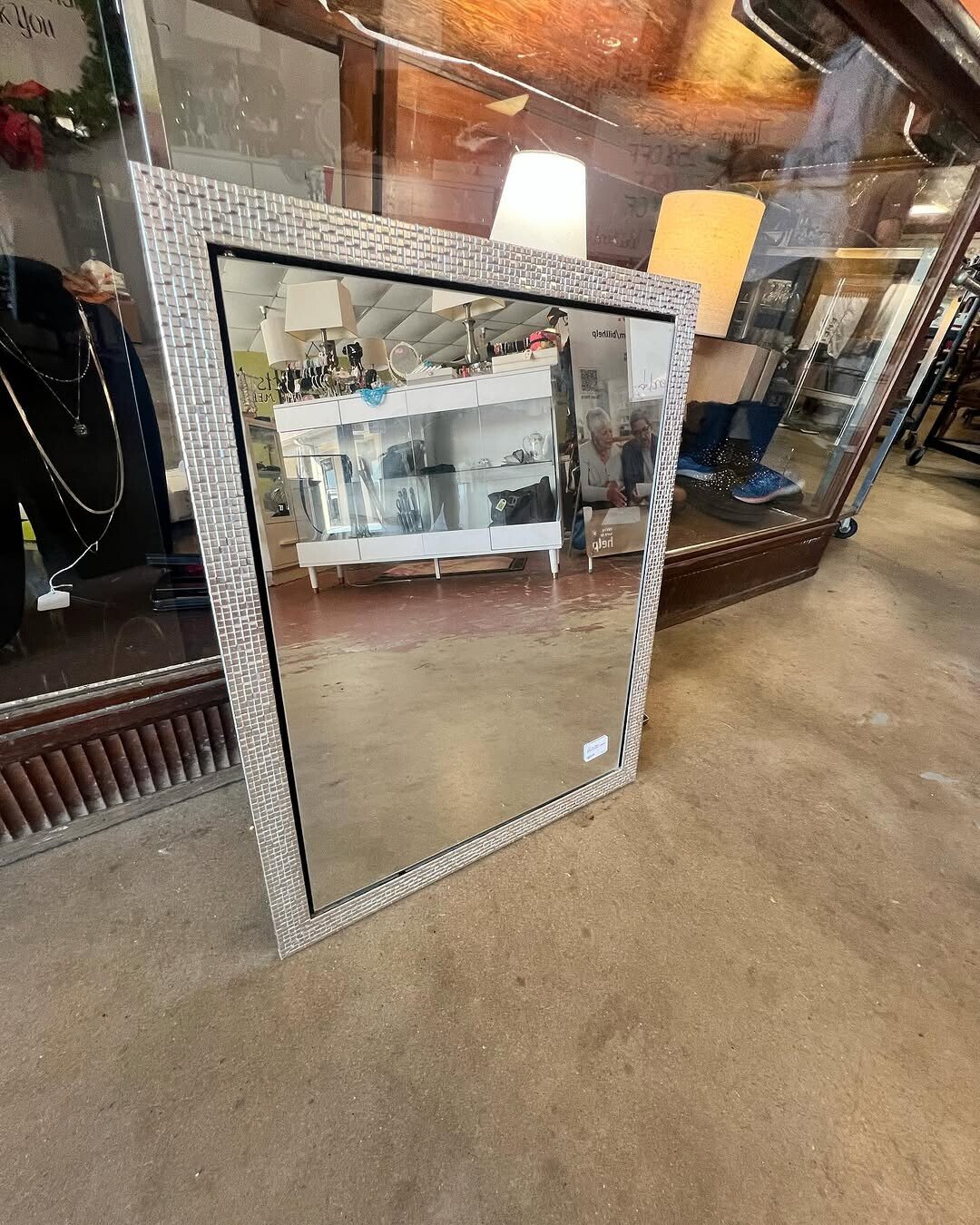 Stylish mirror catches attention. Silver mosaic frame stands out. It leans against a floor in an antique shop, hinting at timeless elegance. Reflections reveal a white display cabinet and various lighting fixtures. Light plays off surfaces, creating warmth.