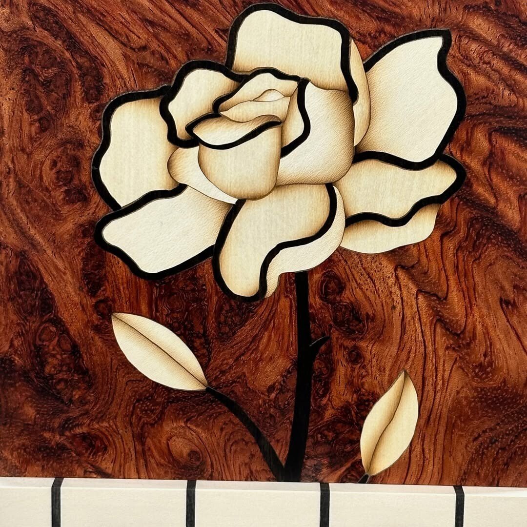 Contrast with black outlines sharpens details. This technique highlights craftsmanship. Such artistry connects to nature. Roses symbolize love and beauty. Wood as a medium adds richness and texture.