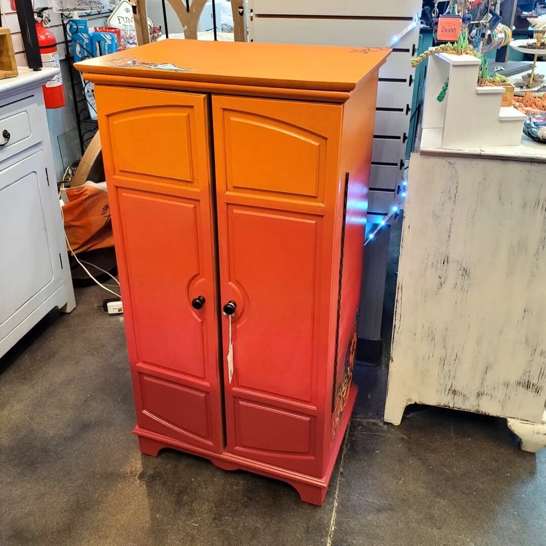 Stylish wooden cabinet stands out. Bright orange fades to deep red. Color gradient adds energy. Two doors with black circular handles create contrast. Simple yet modern design fits well in contemporary spaces.