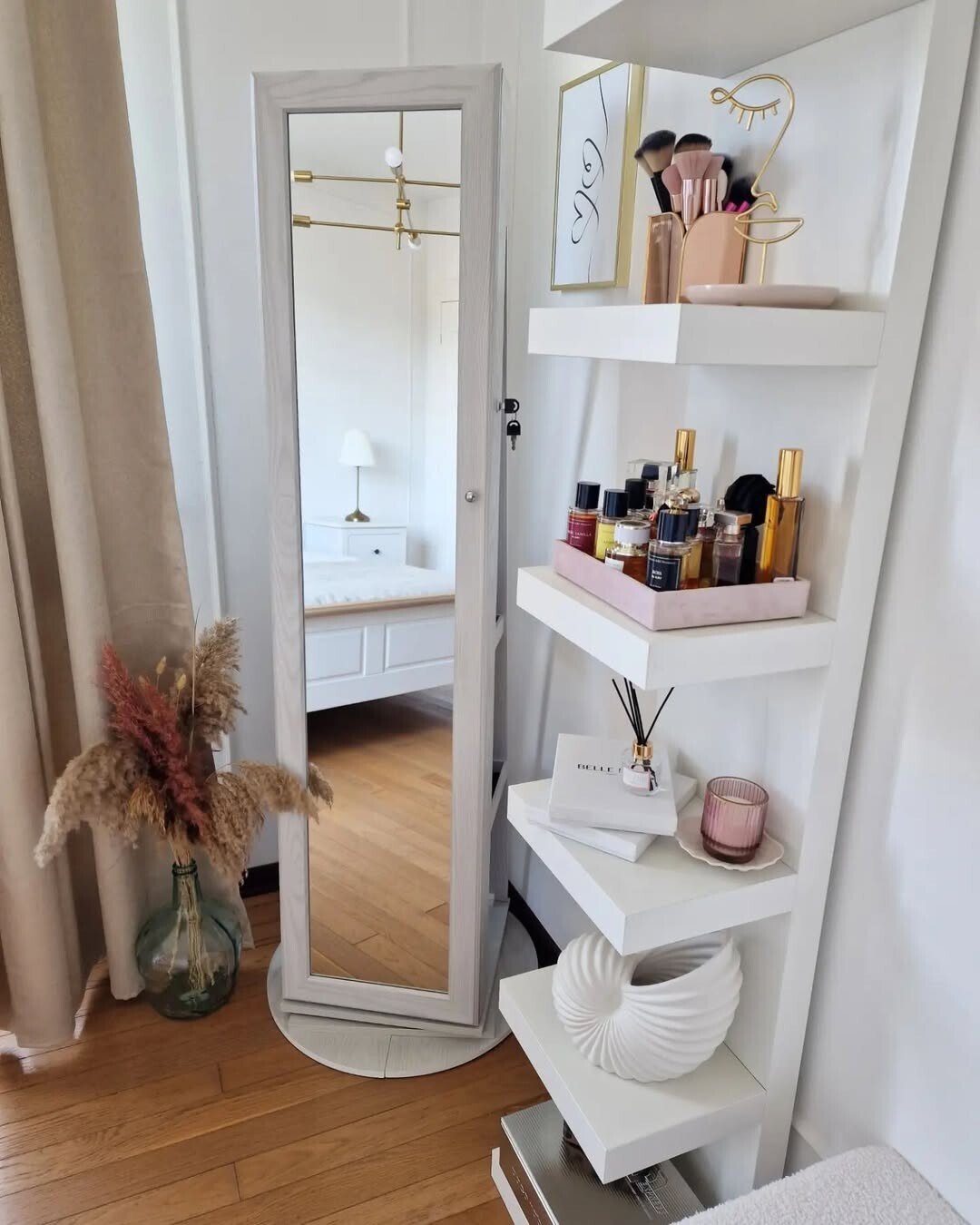 Elegant spaces matter. This room corner shines with style. A tall, slim mirror reflects light and adds depth. White shelving unit stands out. It holds perfumes, decorative items, and a chic candle. Each piece is neatly arranged, showing care and thought.