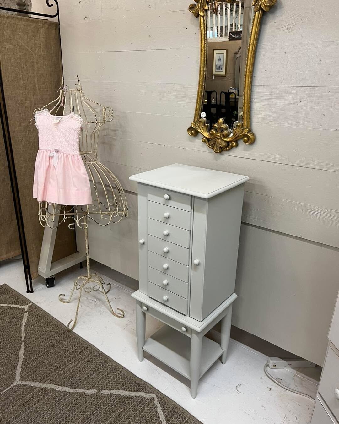 Elegant jewelry armoire shines in sleek white finish. Tall and stylish, it serves dual purposes: storage and mirror. Open it up, and a world of organization awaits. Compartments and hooks hold necklaces, earrings, and bracelets neatly.