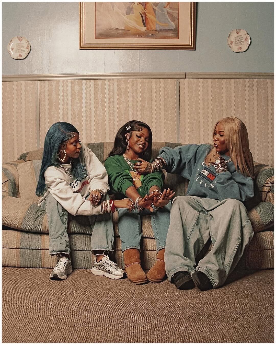 Three young women radiate joy on a vintage couch. Their trendy streetwear stands out. Each outfit blends comfort and style. Jewelry catches light, adding sparkle to their playful moments. Soft pastels form a calm backdrop. Decorative plates hang behind them, hinting at personal stories or memories.