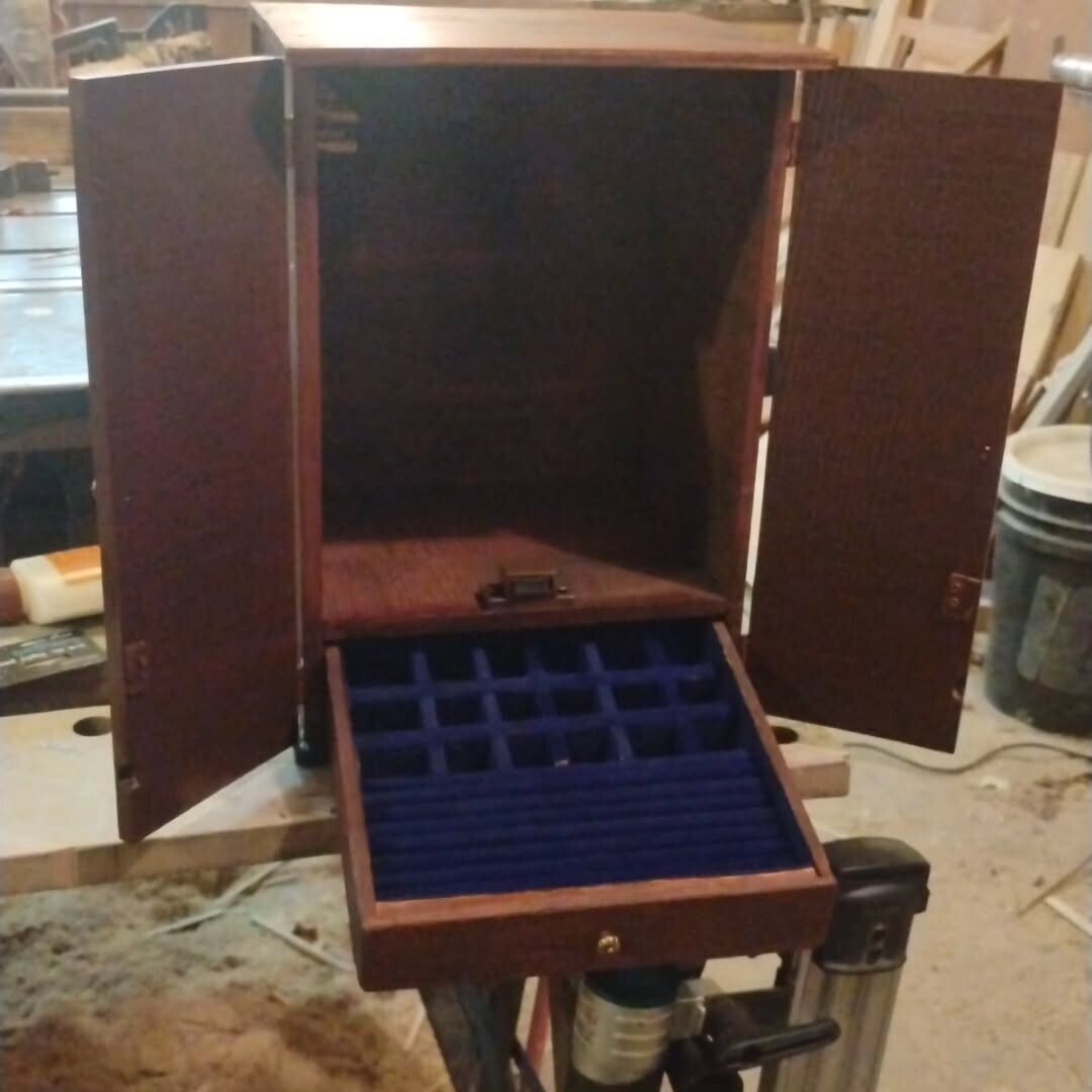 Wooden display cabinet shines. Opens wide. Plush blue interior stands out. Perfect for showcasing collectibles or jewelry. Sliding drawer at bottom holds compartments. Neat organization hints at careful curation.
