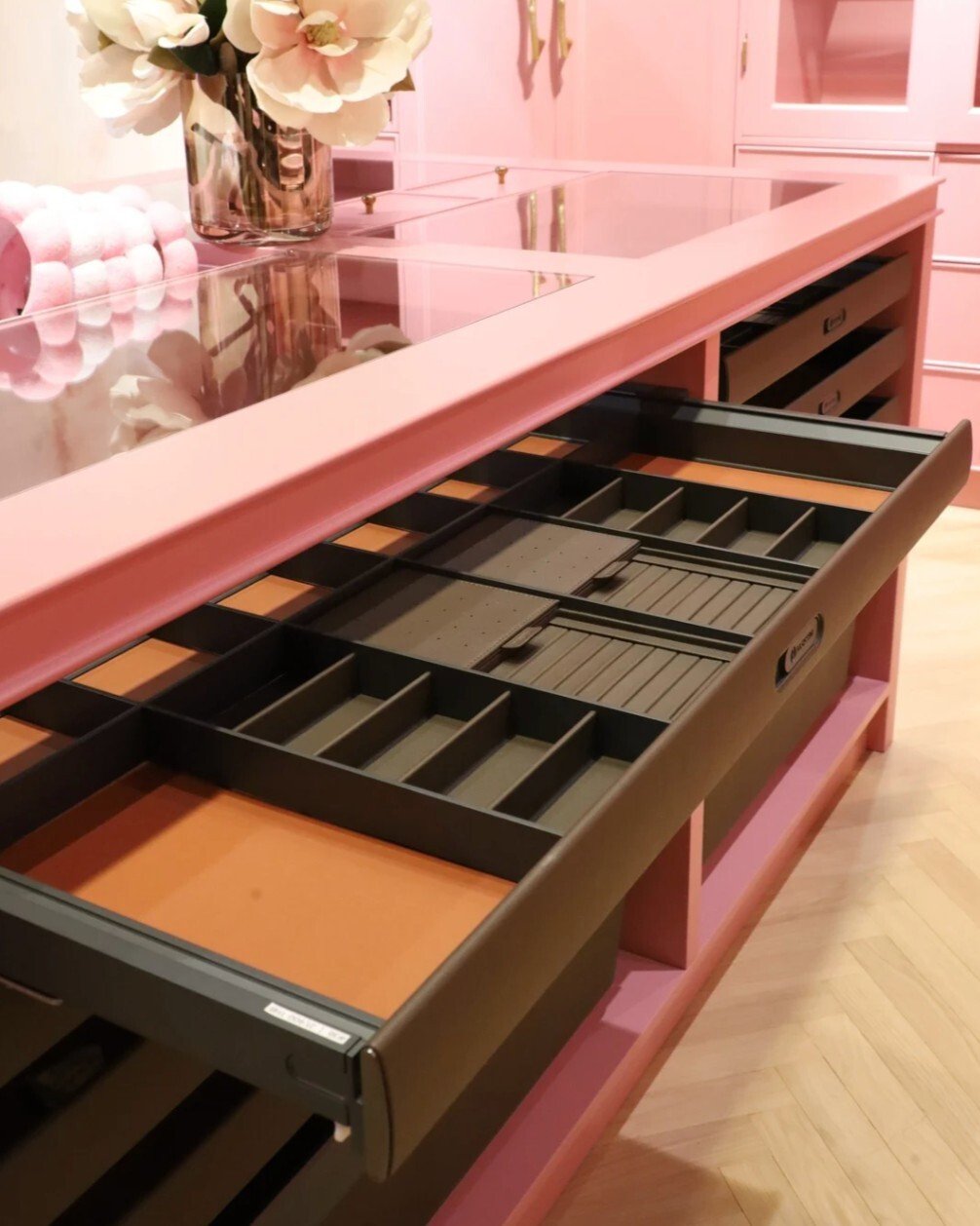 Modern pink cabinetry stands out. Glossy surfaces shine. Open drawer reveals compartments. Organization is key. Clean lines and bright color create a cheerful vibe. White flowers add a touch of nature. They soften the space, introducing warmth.