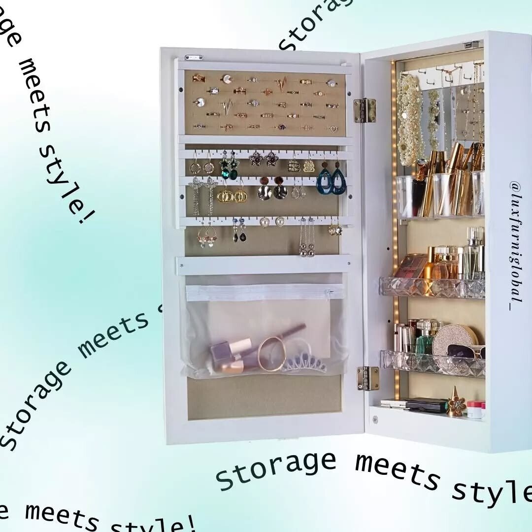 Jewelry and cosmetics storage matters. Organization boosts efficiency. This cabinet shines with style. Hooks hold necklaces. Compartments store rings and lipsticks. A transparent pouch keeps accessories visible. No more digging through drawers.