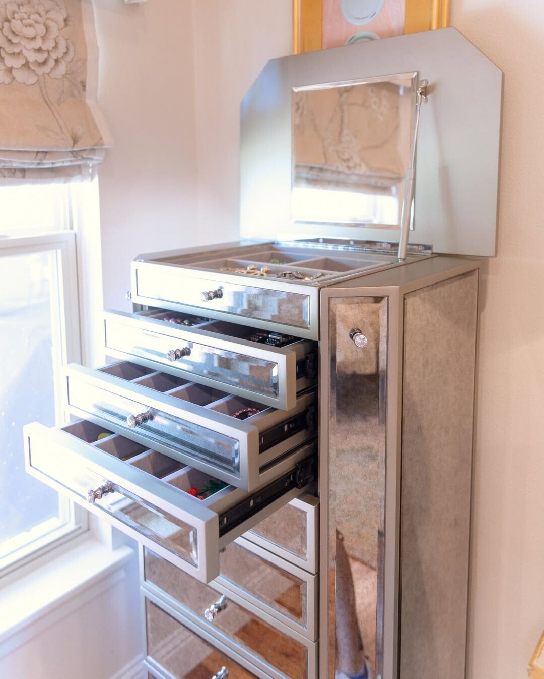 Stylish mirrored jewelry cabinet stands out. It catches light beautifully. Multiple open drawers reveal organized treasures. Neatness matters in jewelry storage. Each compartment serves a purpose. This design emphasizes accessibility. Easy to find favorite pieces enhances daily routines.