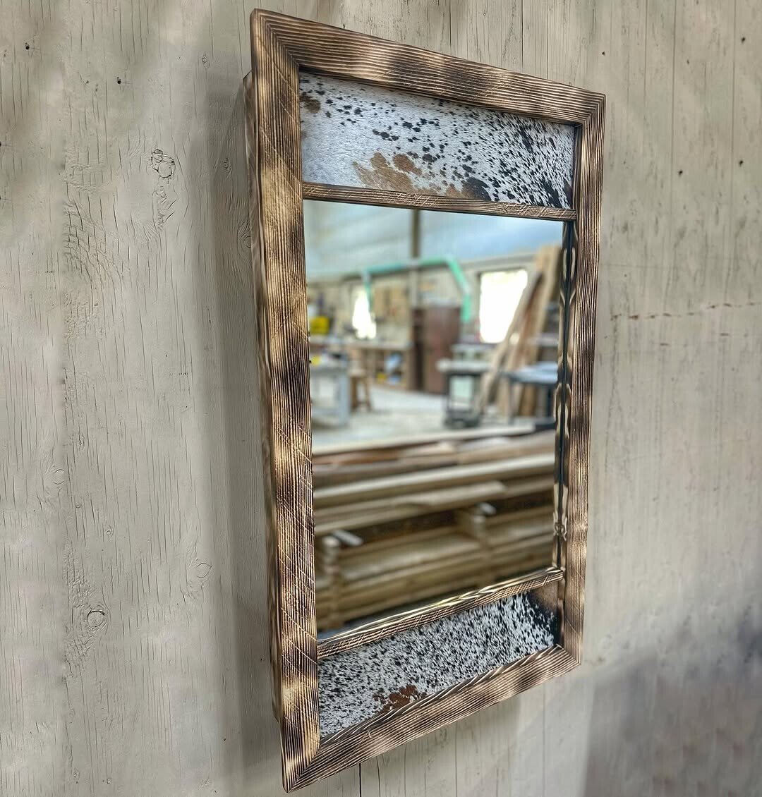 Rustic wooden mirror stands out. Its frame is textured and weathered, showcasing a unique design at the top. Speckled patterns add charm. Such craftsmanship reflects traditional woodworking skills.