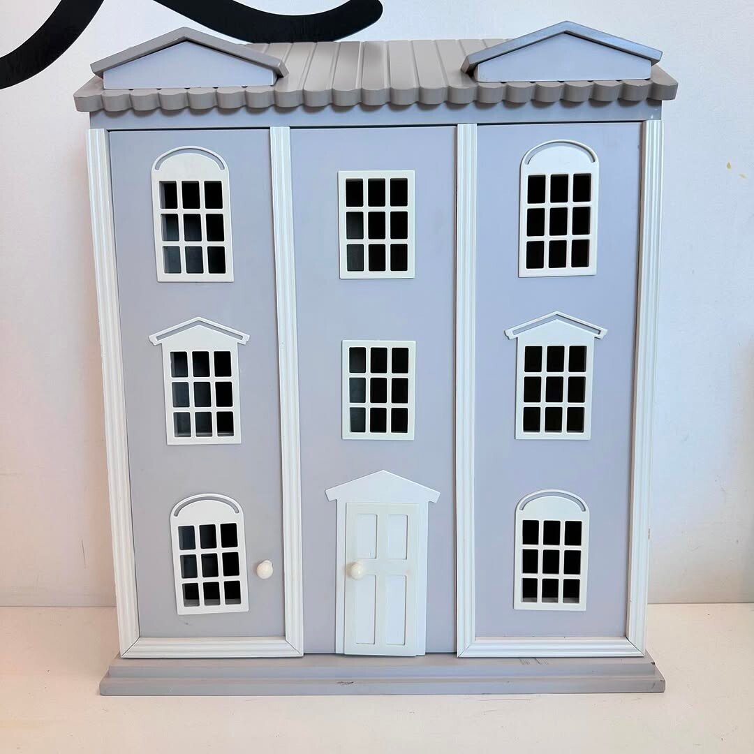 Charming miniature house captures attention. Light gray exterior with white trim stands out. Multiple windows invite light, creating a warm atmosphere. Central door adds balance, welcoming all. Pitched roof enhances its playful design.