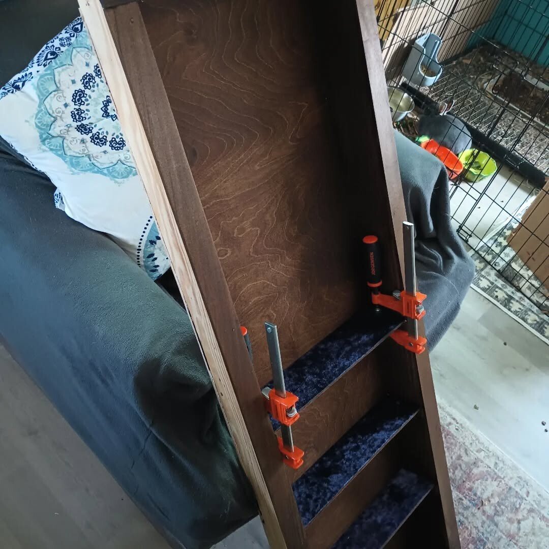 Unfinished wooden cabinet stands out. Visible clamps hold it steady against a couch. Dark shelves hint at storage potential. Cabinets like these are functional. They provide organization. Inside, neatness can thrive.