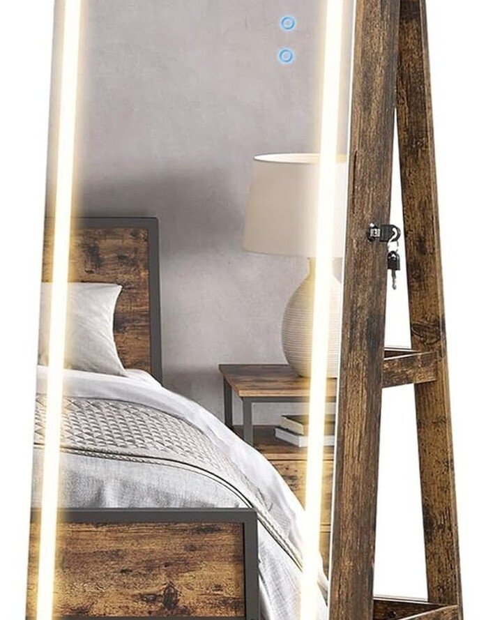 Tall mirror stands proudly. Sleek, rectangular surface reflects surroundings well. Rustic wooden frame adds warmth. This blend of materials shows harmony between nature and modern design.