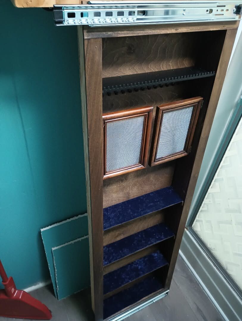 Narrow wooden shelving unit stands out. Rich walnut finish adds warmth and elegance. Open top section features a black mesh panel. This design choice enhances airflow and visibility. Below, ornate framed panels provide a contrast. They draw the eye and suggest craftsmanship.