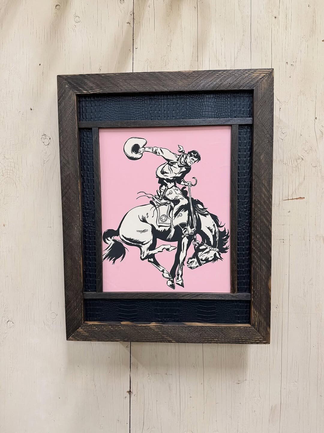 Bold cowboy rides. Horse bucks fiercely. Lasso flies high. Strong action captures spirit of rodeo. Black and white contrast against bright pink background adds drama.