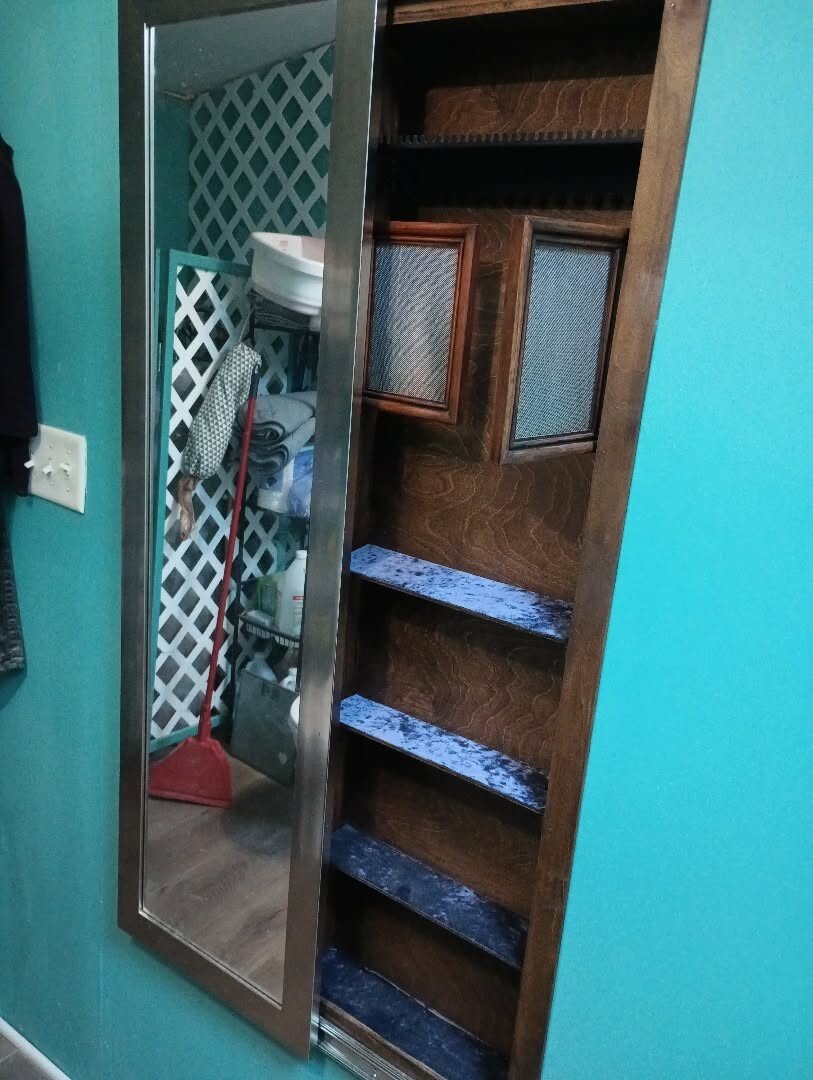 Wall-mounted cabinet shines in bright teal. Mirrored front draws attention. Reflection shows wooden shelves filled with blue fabric. Interesting contrast. Broom and household items peek through glass. This cabinet highlights organization and design.