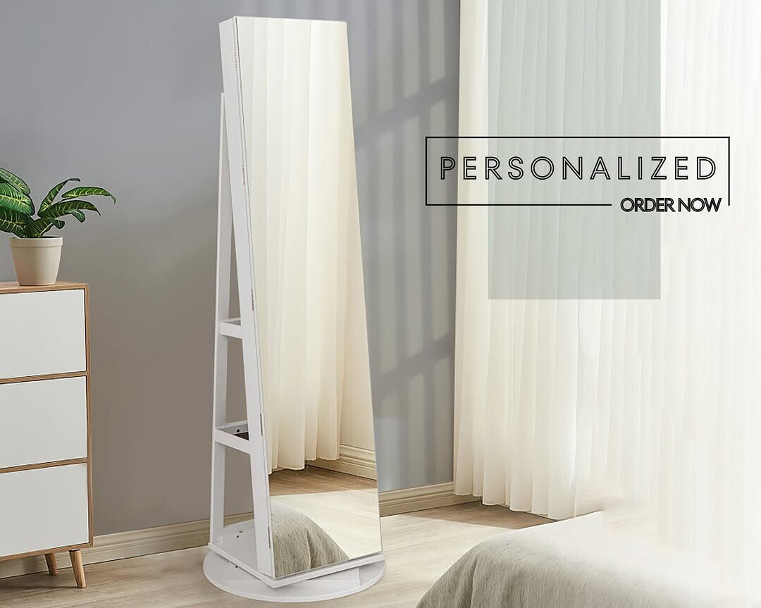 Behind the mirror, an organized storage unit shows practicality. Jewelry and beauty products neatly arranged enhance accessibility and style. White frame adds sophistication, making it a chic addition to any space.