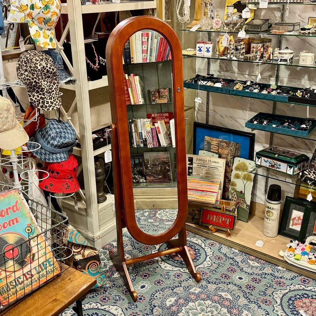 Wooden full-length mirror shines. Rounded frame adds elegance. Placed in cozy antique shop, it draws attention. Surrounding vintage items—hats, books, jewelry—tell stories. Each piece holds history. Colorful carpets and shelves create warmth.