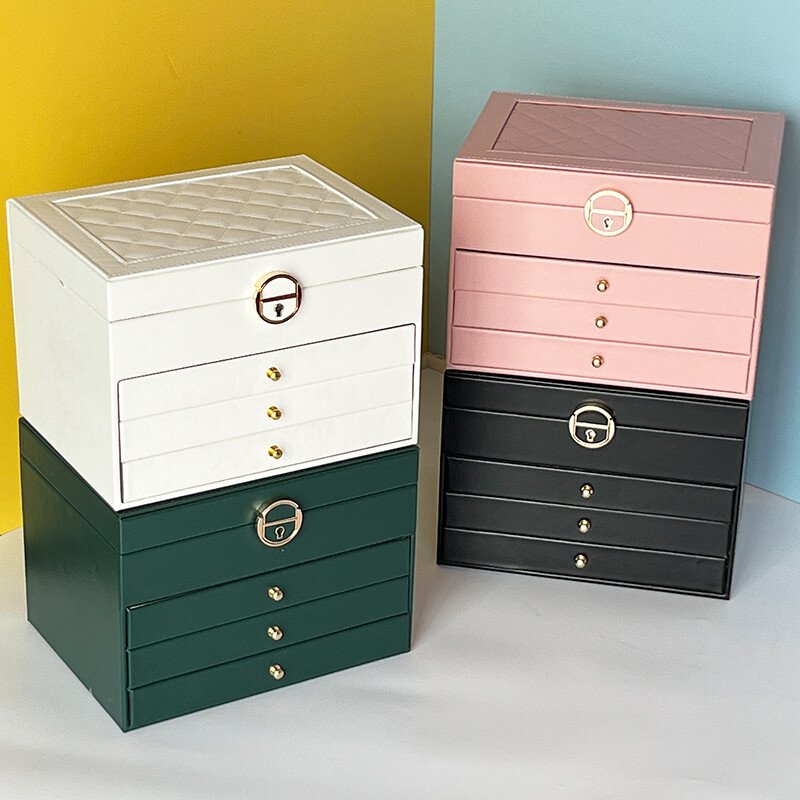 Stylish jewelry storage shines in vibrant colors. White, pink, green, and black boxes stand tall. Each box boasts a modern design. Multiple drawers offer smart organization.