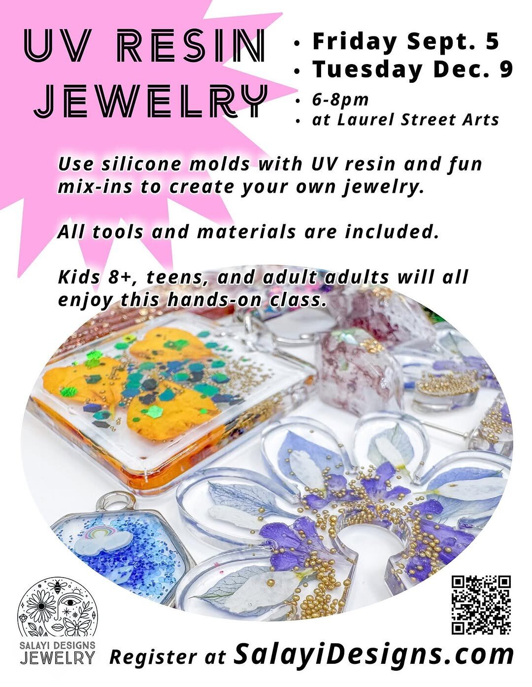 Colorful flyer grabs attention. Bold text highlights key details: event dates, times, and location. Class welcomes ages 8 and up, promoting inclusivity. Using silicone molds and UV resin makes jewelry-making accessible and fun. UV resin cures quickly under light, allowing creativity to flow. Participants can express themselves through unique designs. All materials provided simplifies experience, ensuring focus on learning.