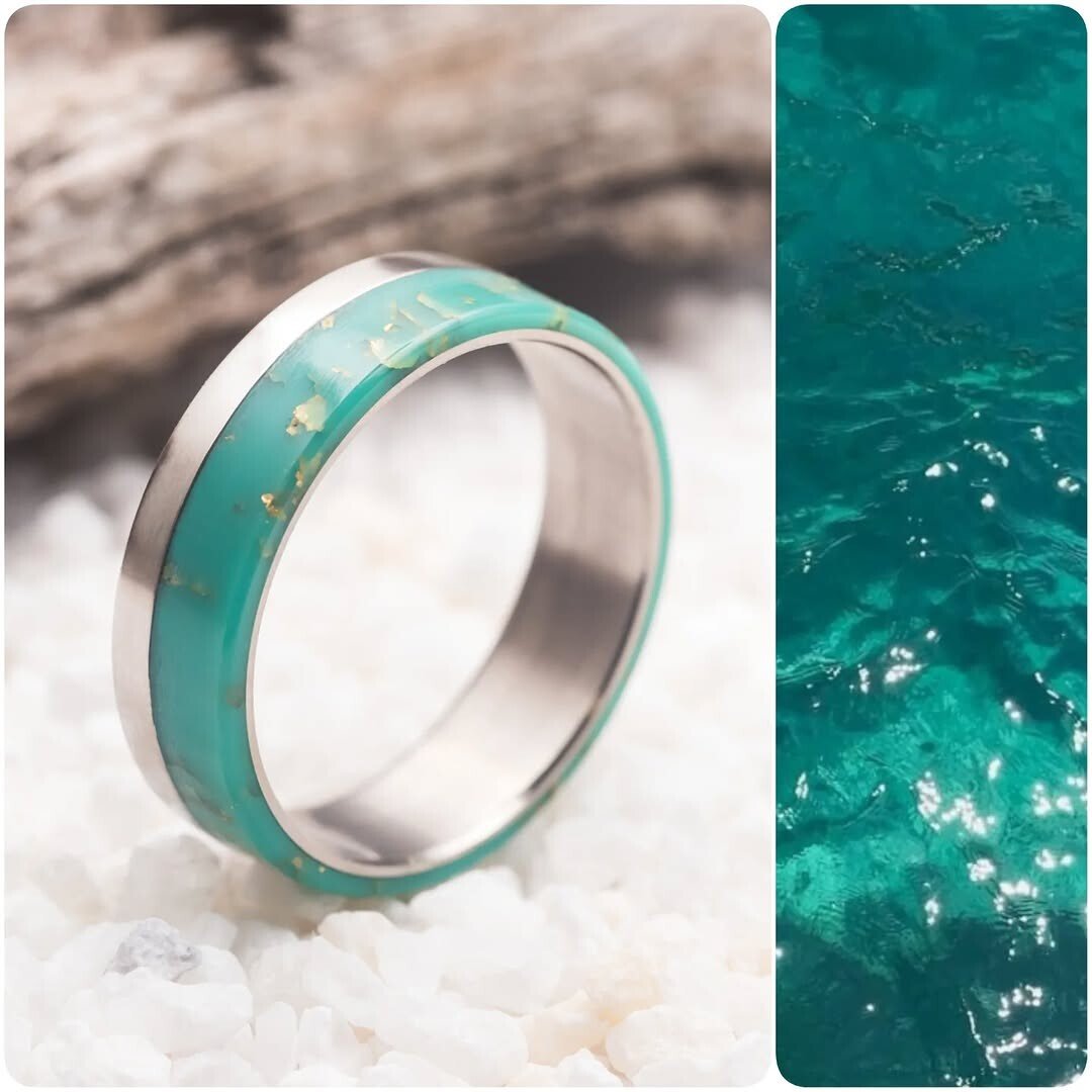 Turquoise ring shines bright. Silver band adds elegance. Placed on soft white sand, it creates a contrast. Colors pop! The turquoise waters in the background glimmer under sunlight, enhancing the beach vibe.