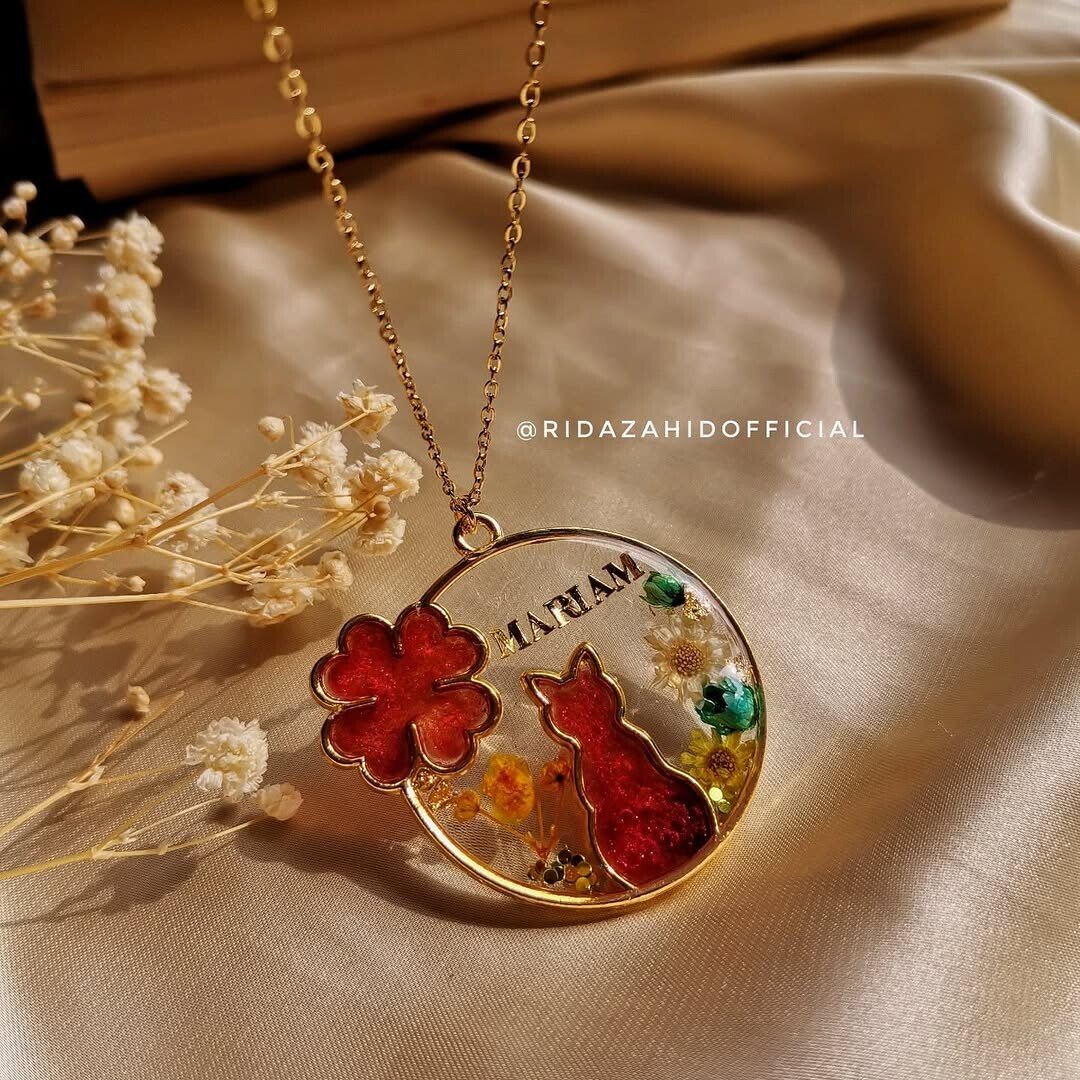 Stylish necklace shines brightly. Circular pendant grabs attention. Silhouette of a cat adds charm. Cats symbolize independence and mystery. Flower brings life and vibrancy. Dried flowers in resin create a unique look. This blend of nature and art evokes beauty.