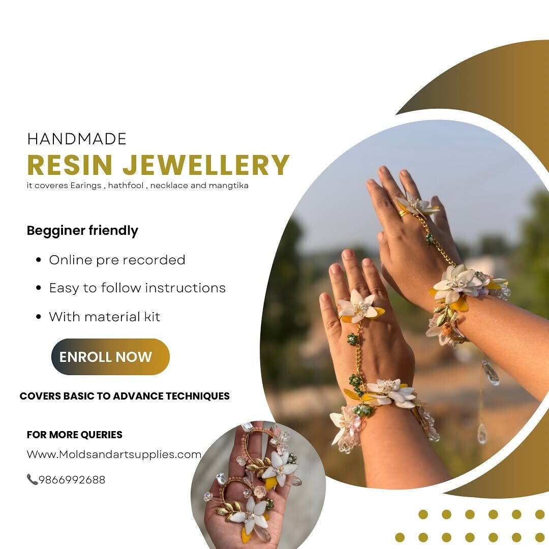 Bright colors shine in elegant resin jewelry. Handmade pieces like earrings, necklaces, and mangalsutra catch the eye. Each item showcases creativity and craftsmanship. Workshop offers beginner-friendly sessions. Online pre-recorded classes make learning easy. Clear instructions guide every step. Material kits included. No need to worry about supplies.
