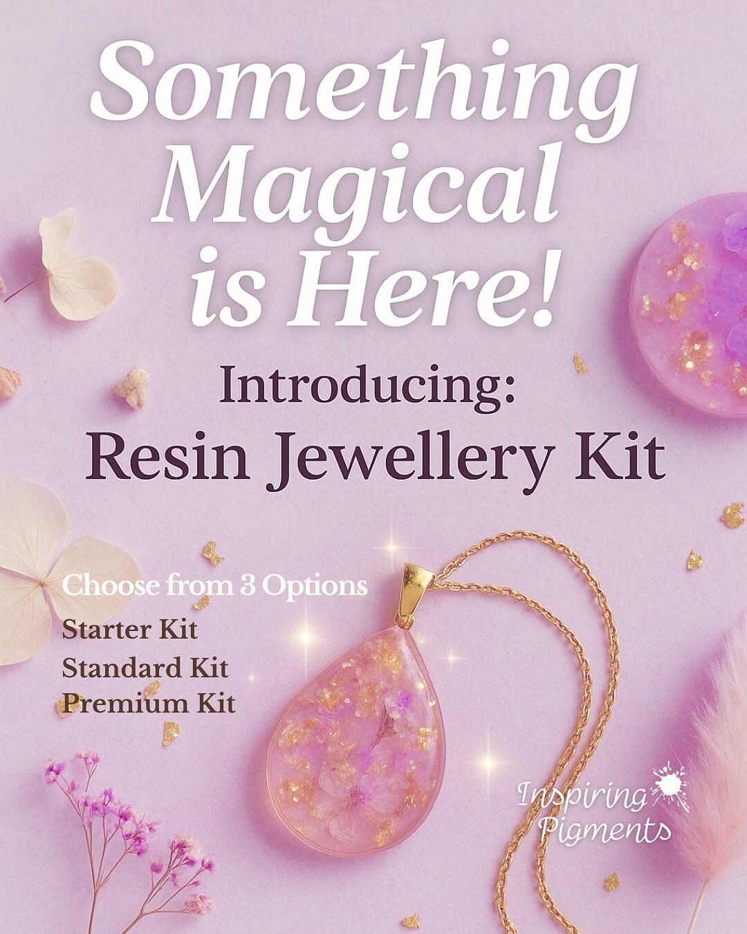 Whimsical design shines in this promotional graphic for a Resin Jewellery Kit. Delicate floral elements frame a sparkling pink pendant, creating an inviting scene. The bright colors attract attention and spark joy. Three options appear: Starter, Standard, Premium. Each option appeals to different skill levels and budgets, making resin crafting accessible.