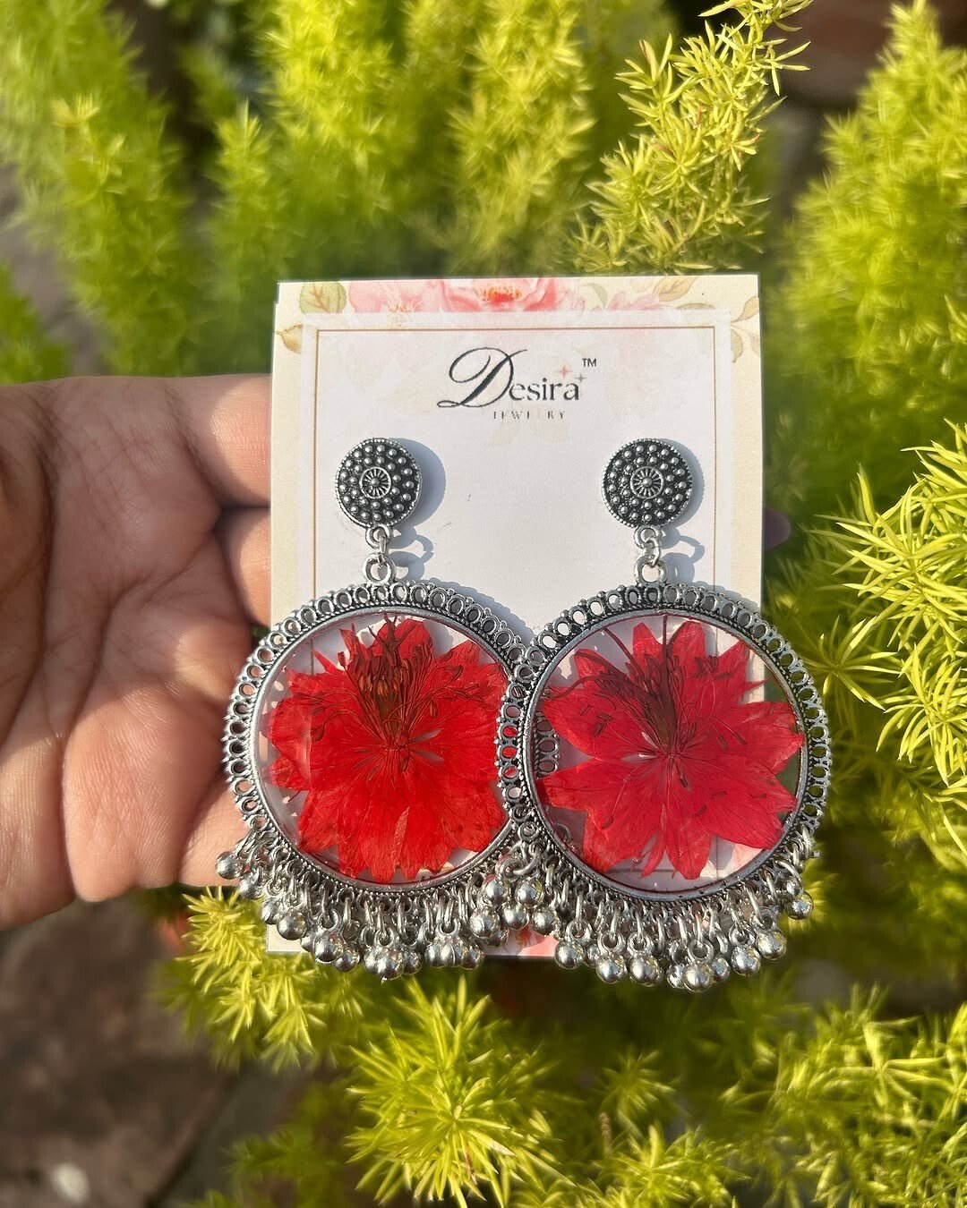 Vibrant circular earrings draw attention. Red pressed flowers shine brightly in resin. Flowers symbolize beauty and nature. Encasing them preserves their essence. Intricate silver detailing adds elegance. Silver often represents purity and sophistication. Small dangling embellishments bring movement. They catch light, creating a playful effect.