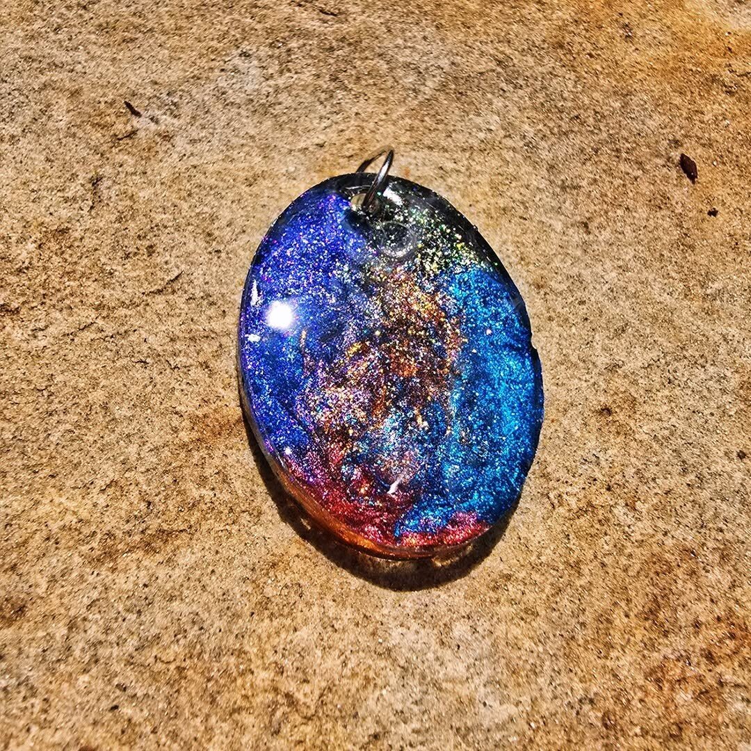 Pendant shines brightly. Resin captures colors well. Blue, gold, and red swirl together. Looks like a galaxy. Cosmic themes in art represent wonder and curiosity about space. Each hue has meaning. Blue symbolizes calmness. Gold represents wealth and light. Red often stands for passion. Together, they create a stunning effect.