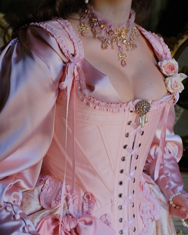 Elegant corset dress shines in soft pink. Delicate ruffles flow gracefully, adding softness. Floral embellishments bring nature's beauty into fashion. Each detail captures attention, creating a romantic vibe. Opulent necklace enhances the look, suggesting wealth and status.
