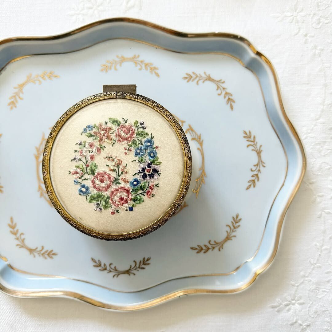 Ornate tray shines. Light blue color pops. Golden detailing adds elegance. Round box sits proudly. Colorful floral embroidery catches the eye. Creamy fabric background offers contrast.