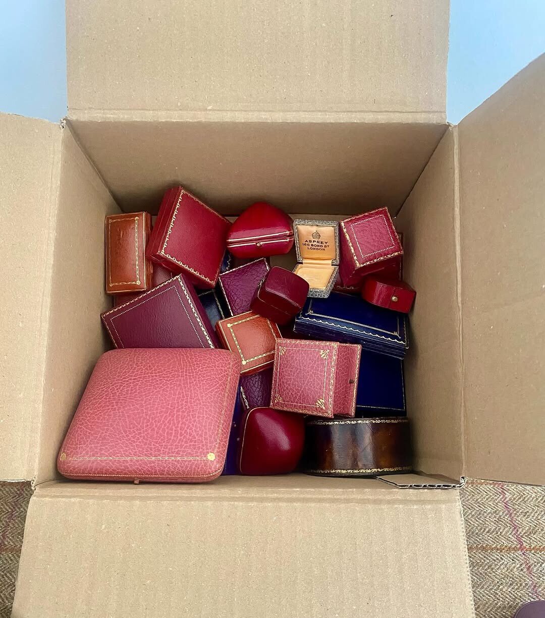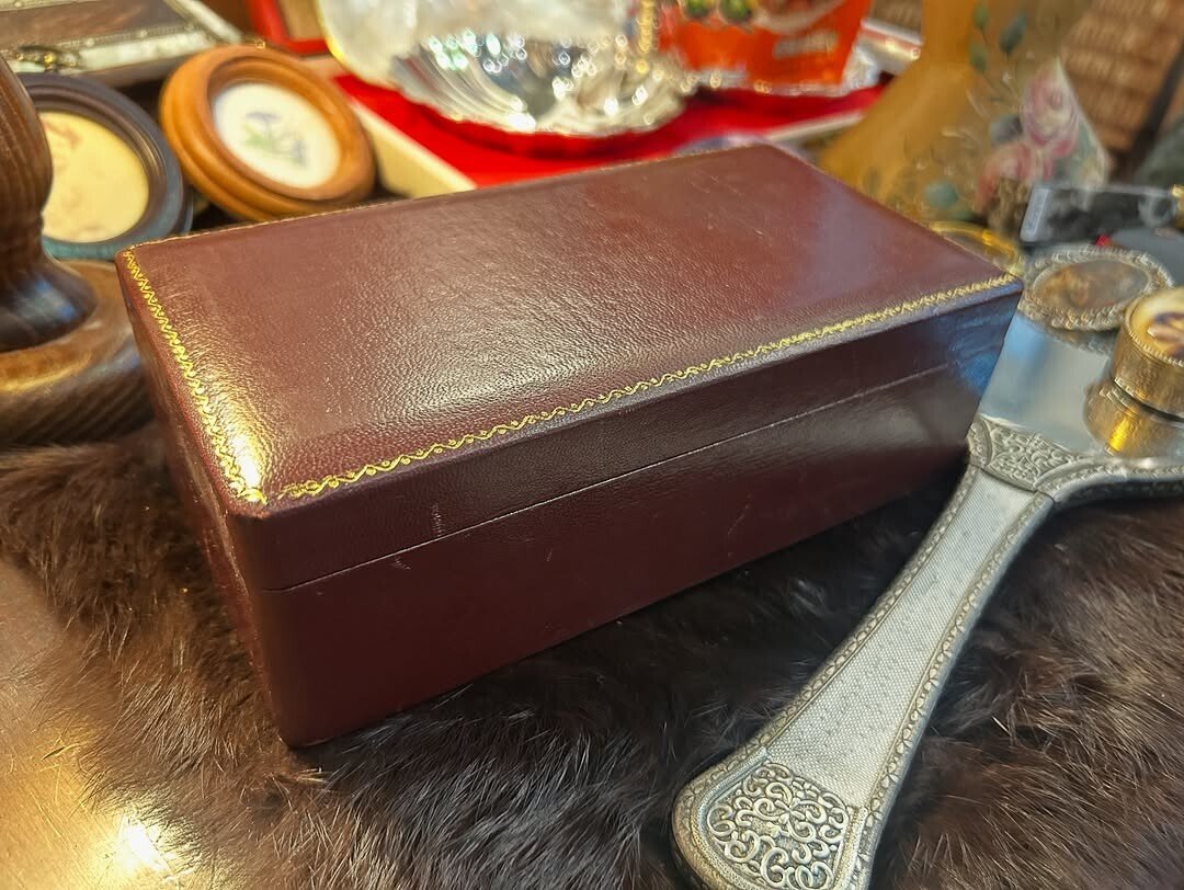 Open box reveals treasures. Small leather cases in red, purple, brown. Each case unique. Intricate stitching catches eyes. Brand labels peek out, hinting at quality and craftsmanship.