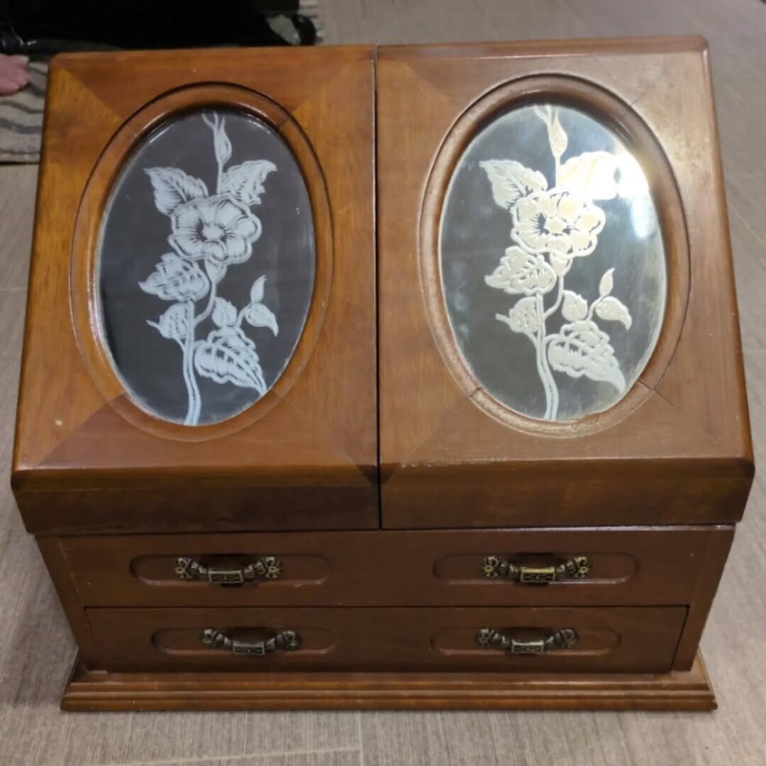 Wooden box shines. Rich finish catches eyes. Oval glass panels tell a story. Floral engravings show craftsmanship. Each detail matters. Drawers at the base add function. Decorative metal handles enhance beauty.
