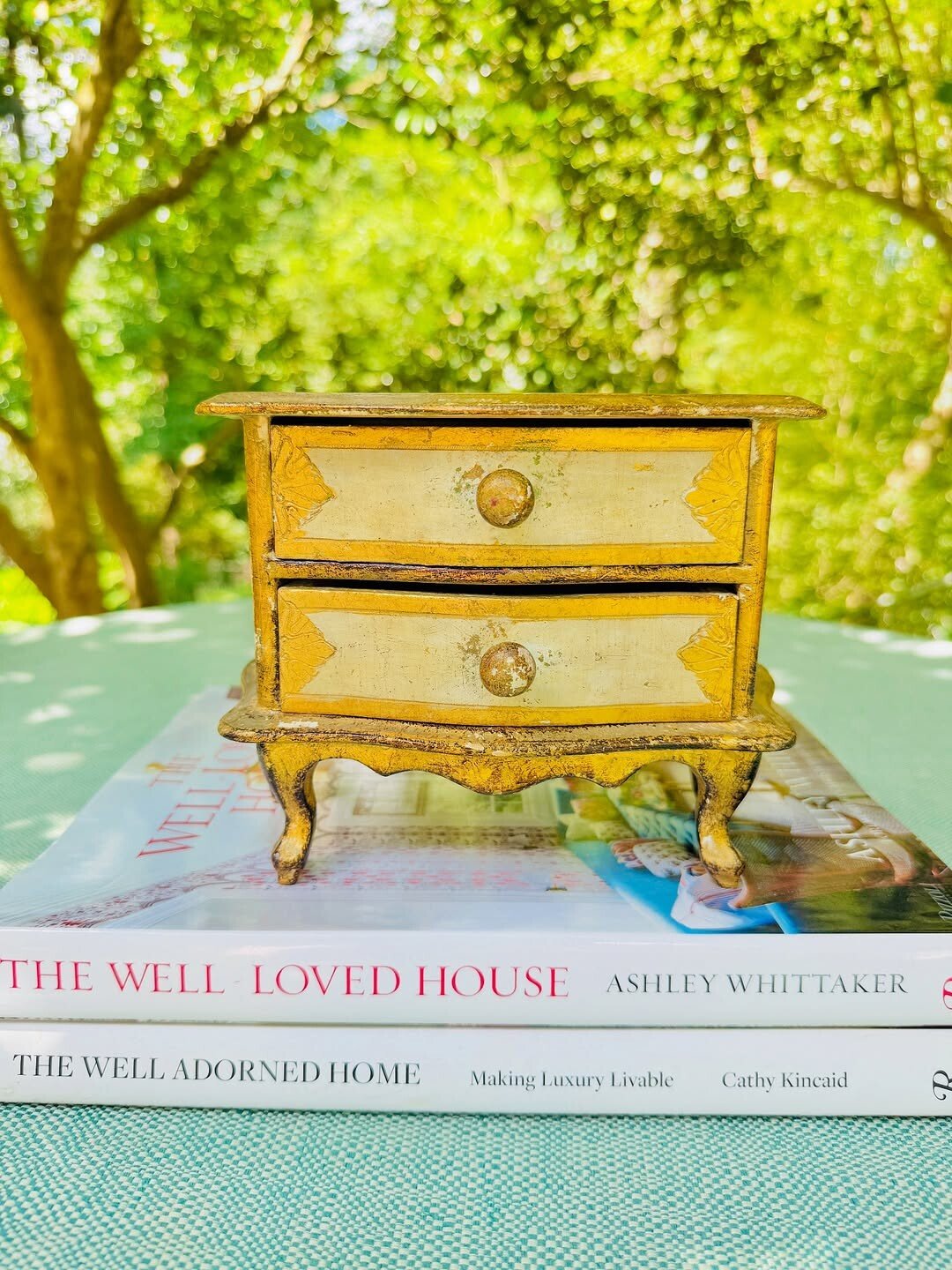 Vintage wooden chest stands out. Its yellow and white finish shows wear. Distressed details tell stories. Each scratch adds charm. Perched on books, it connects style and knowledge. Titles like "THE WELL LOVED HOUSE" suggest warmth and comfort. "THE WELL ADORNED HOME" hints at beauty in design. Sunlight filters through, creating a serene vibe. Greenery surrounds, adding life. Nature and décor blend harmoniously.