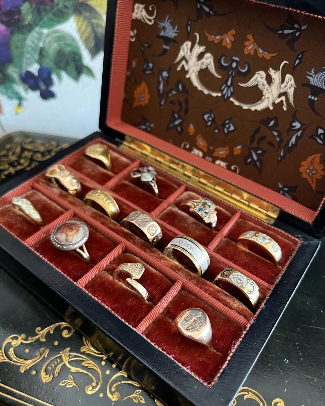 Elegant jewelry box shines with beauty. Twelve rings rest inside, each unique. Gold and silver styles stand out. Detailed carvings catch the eye. Gemstones sparkle, adding color and charm. A special portrait ring draws attention too.