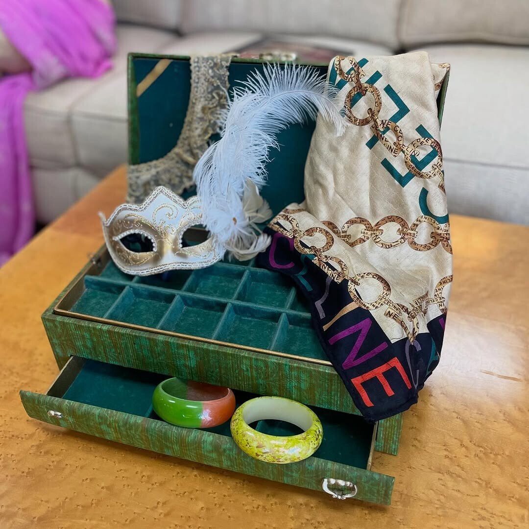 Green box stands out. Velvet interior adds luxury. Compartmentalization shows careful organization. Central focus: shimmering mask. Masks carry deep symbolism. They represent identity and transformation. Delicate embellishments catch light, hinting at artistry and craftsmanship. Feathered accessory enhances drama. Feathers often signify power or spirituality in cultures. Colorful silk scarf introduces vibrancy. Scarves can convey personal style or cultural heritage. Open drawer reveals two vibrant bangles. Bangles symbolize unity and friendship. They often appear in rituals or celebrations. Overall, this image highlights connections between fashion, culture, and identity. Each element tells a story. Together, they show how adornments can reflect deeper meanings in life. Intriguing interplay of beauty and significance exists here.