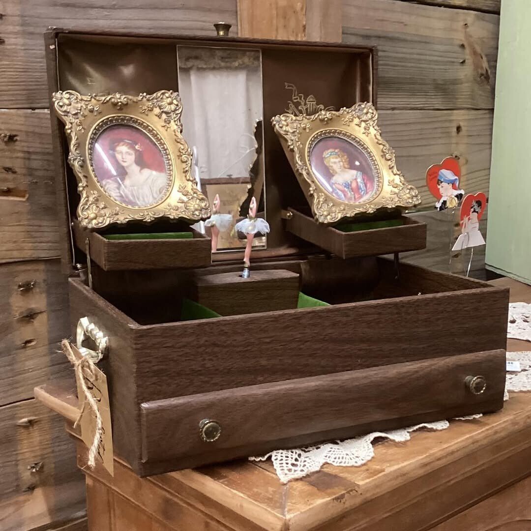 Intricate craftsmanship shines in the wooden box. Rich brown finish captures attention. Ornate picture frames flank the central compartment. Those frames hold vintage portraits, hinting at stories long past. Each figure gazes outward, connecting history to present.