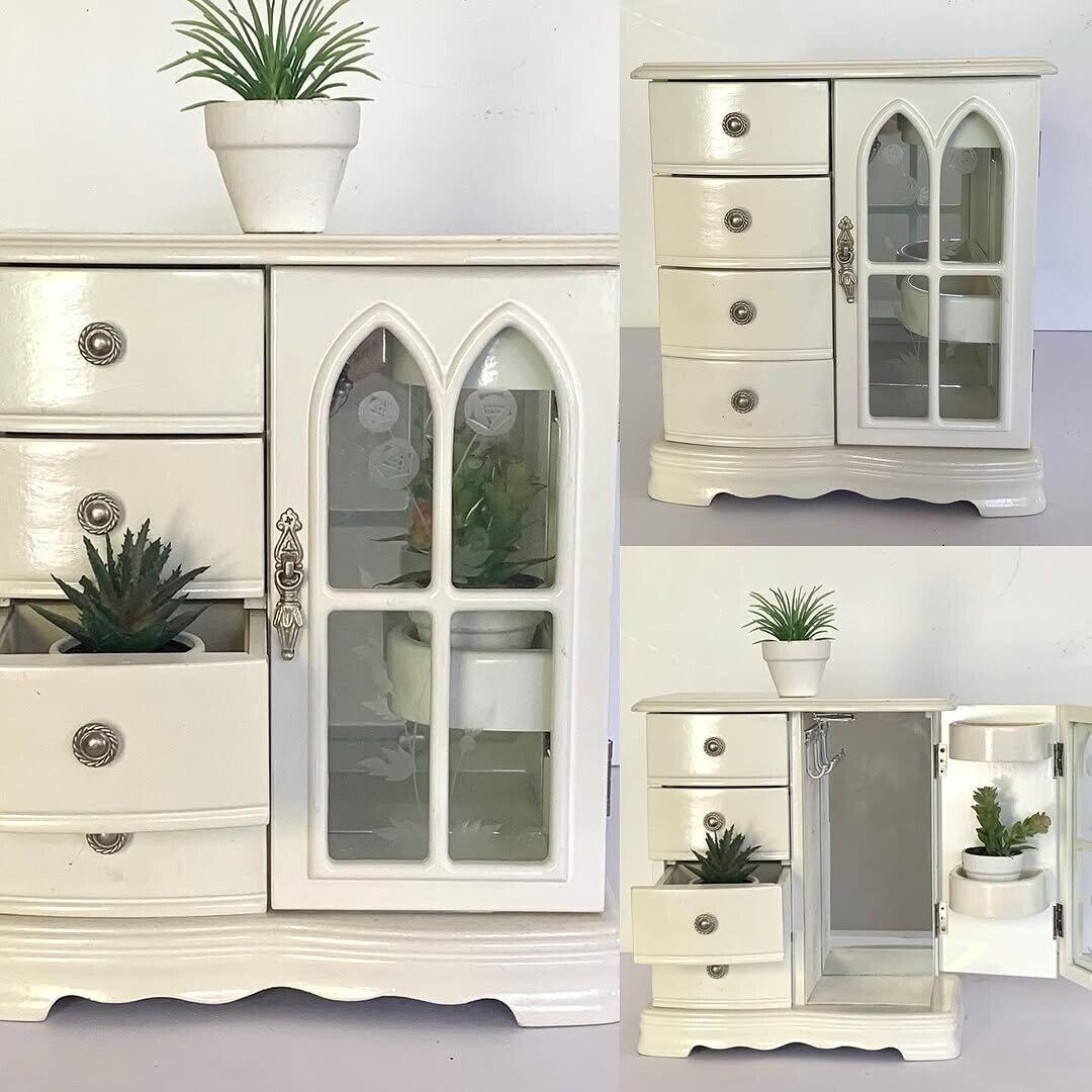 Elegant design shines. White cabinet stands out. Glass door resembles a church window. This shape adds character and charm. Inside, storage compartments are neatly arranged. Small drawers offer practicality. Decorative knobs bring a touch of style. A potted plant sits on top, softening the overall look.