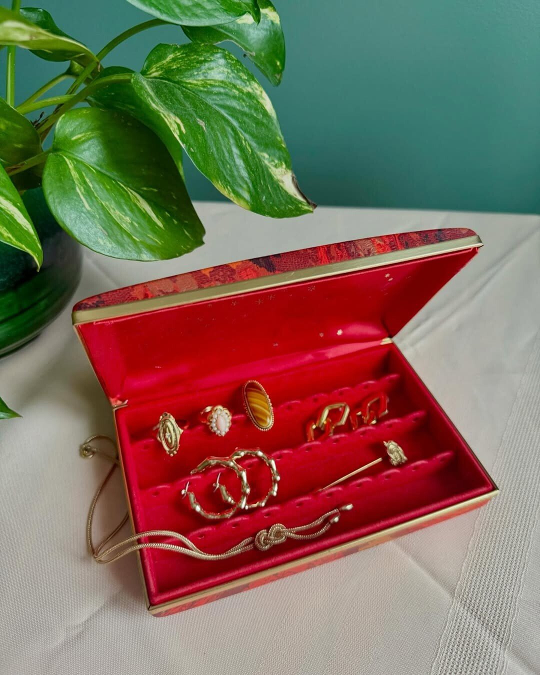 Elegant red jewelry box stands out. Rich color captures attention. Inside, gold and gold-tone earrings shine brightly. Each piece tells a story of craftsmanship. Delicate chain adds charm. Plush red interior enhances luxury feel.
