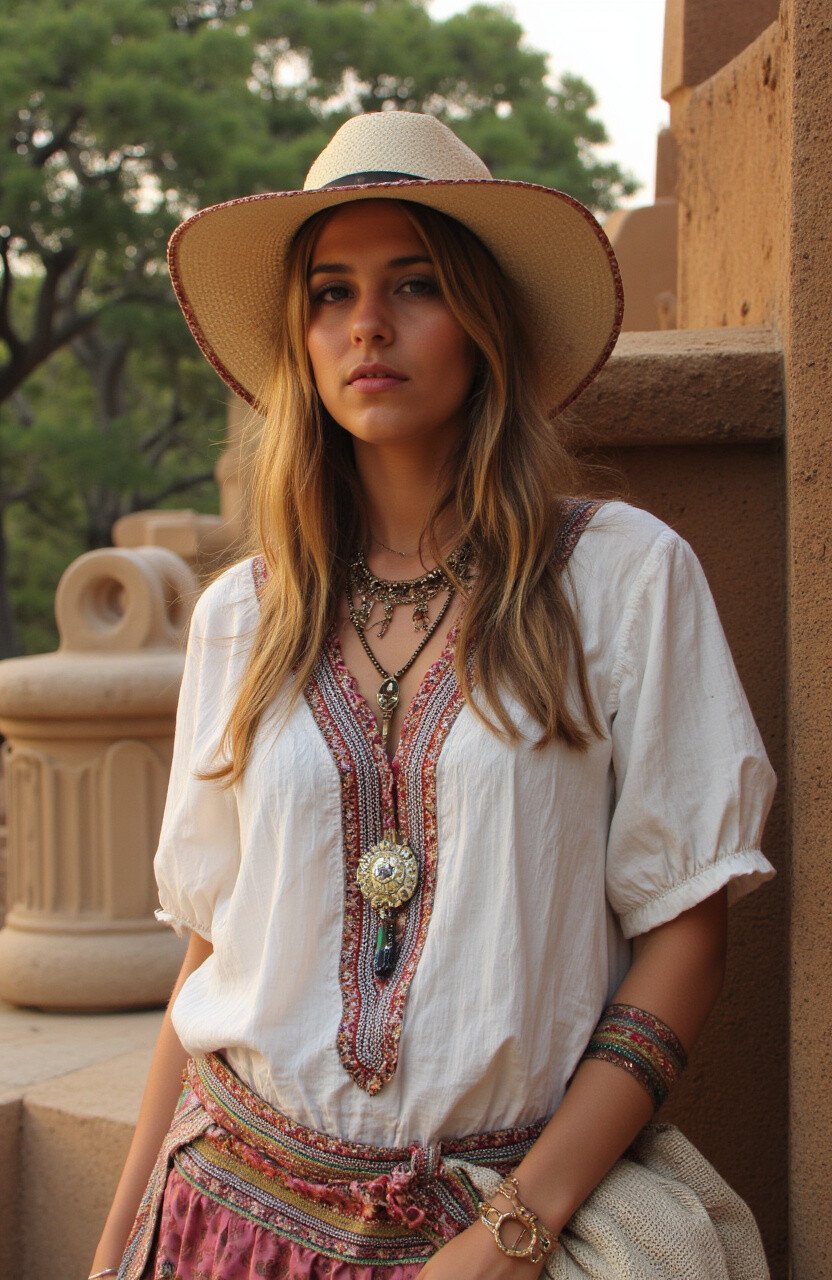 Boho style is all about free spirits and artistic vibes. Think flowy skirts, layered necklaces, and wide-brim hats.