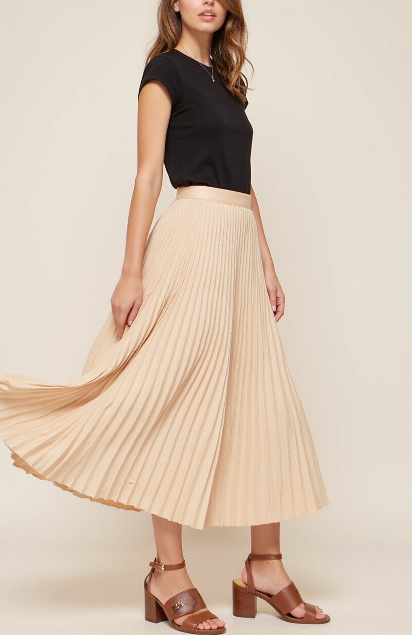 This skirt features a soft, creamy color reminiscent of a chai latte. The pleats add movement and grace to your outfit.
