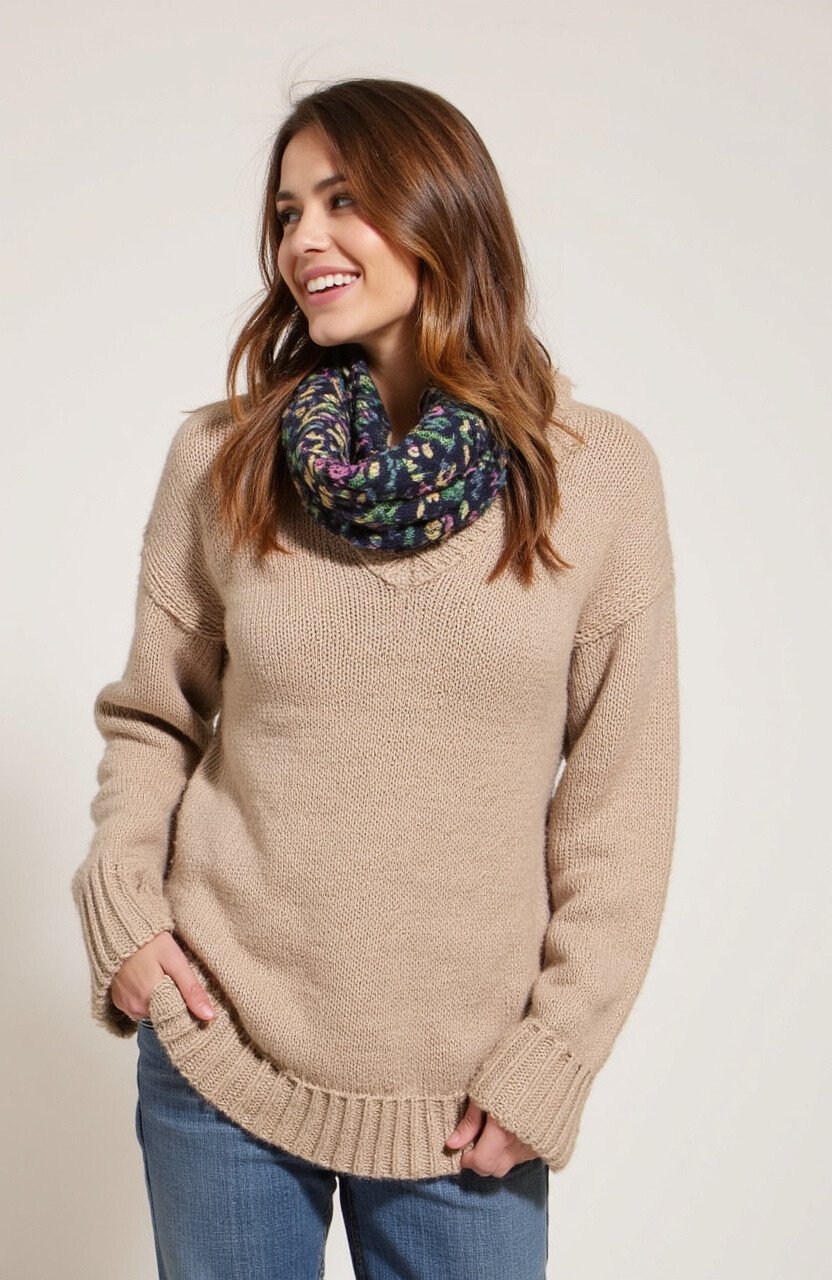 Warm up with a cozy knit sweater in a soft cappuccino hue. Its inviting color and plush fabric make it feel like a gentle hug.