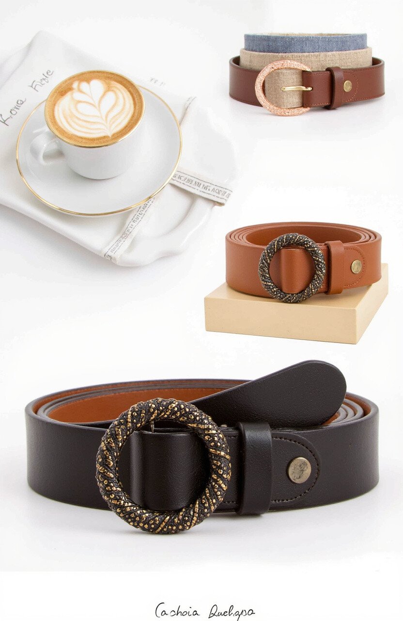 This belt features a buckle designed to look like a coffee ring stain, adding a playful touch to your ensemble.