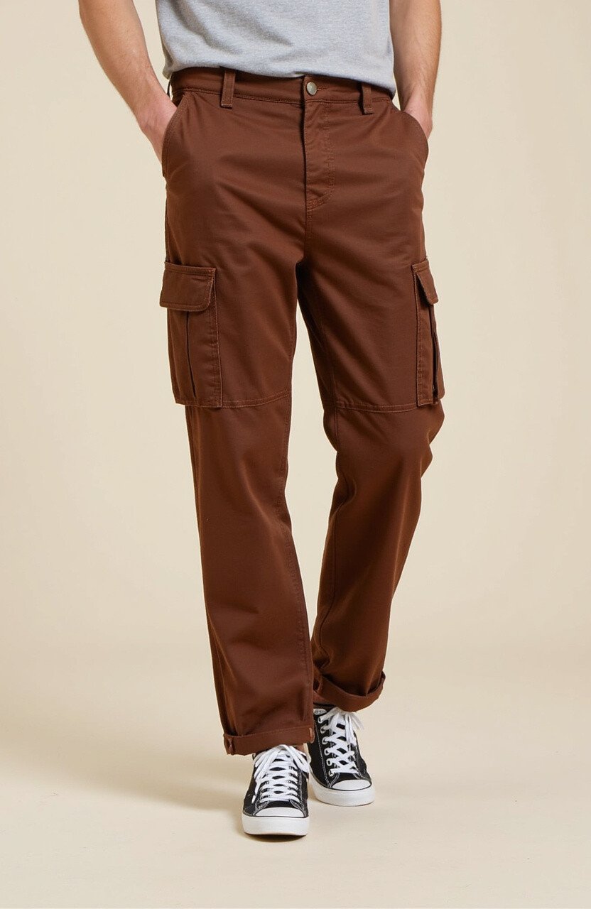 These pants come in a deep, cool brown, ideal for those who love a practical yet stylish look. The multiple pockets add functionality.
