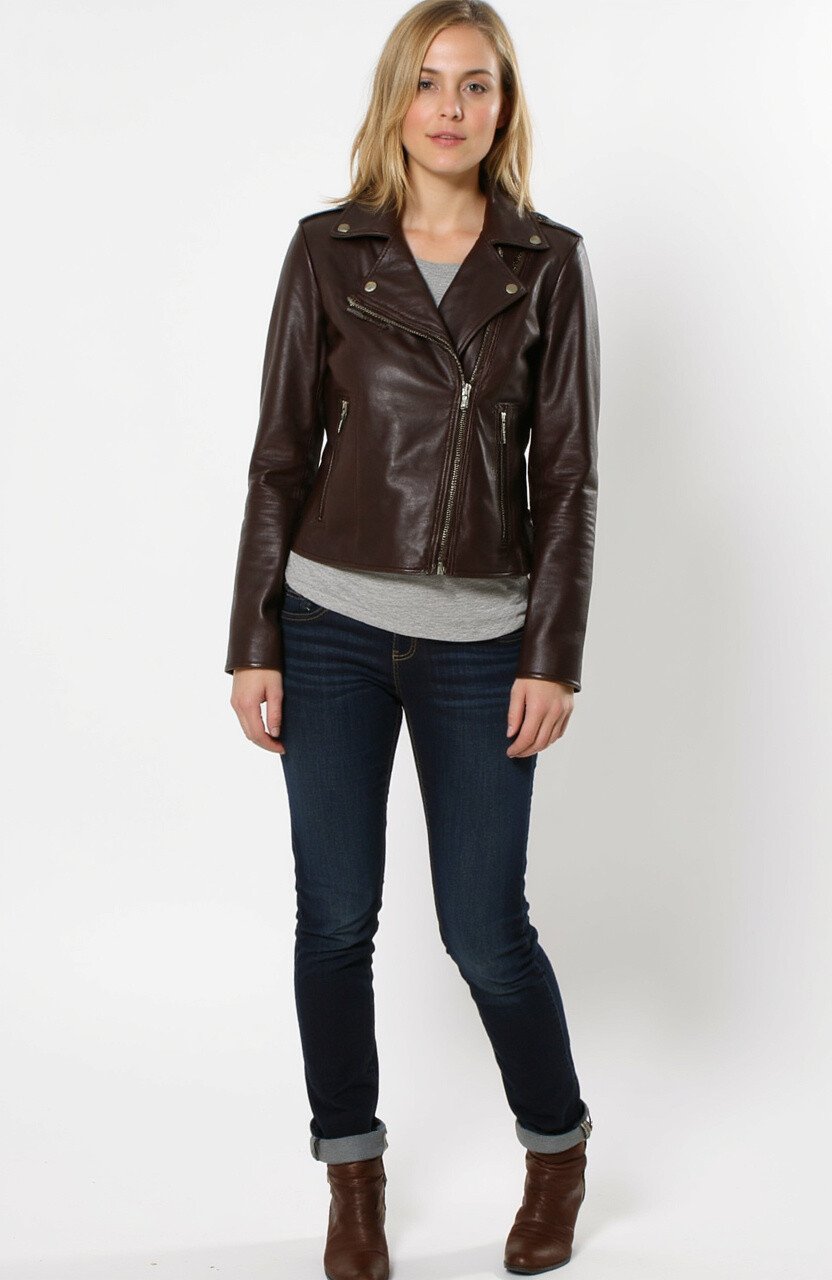 This sleek, dark brown leather jacket resembles the rich color of espresso beans. The smooth texture and snug fit make it a stylish choice for any casual outing.