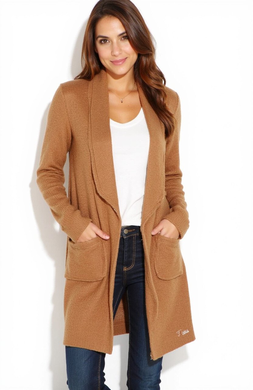 This cardigan comes in a rich caramel color, perfect for adding warmth to your ensemble. The open front makes it easy to layer.