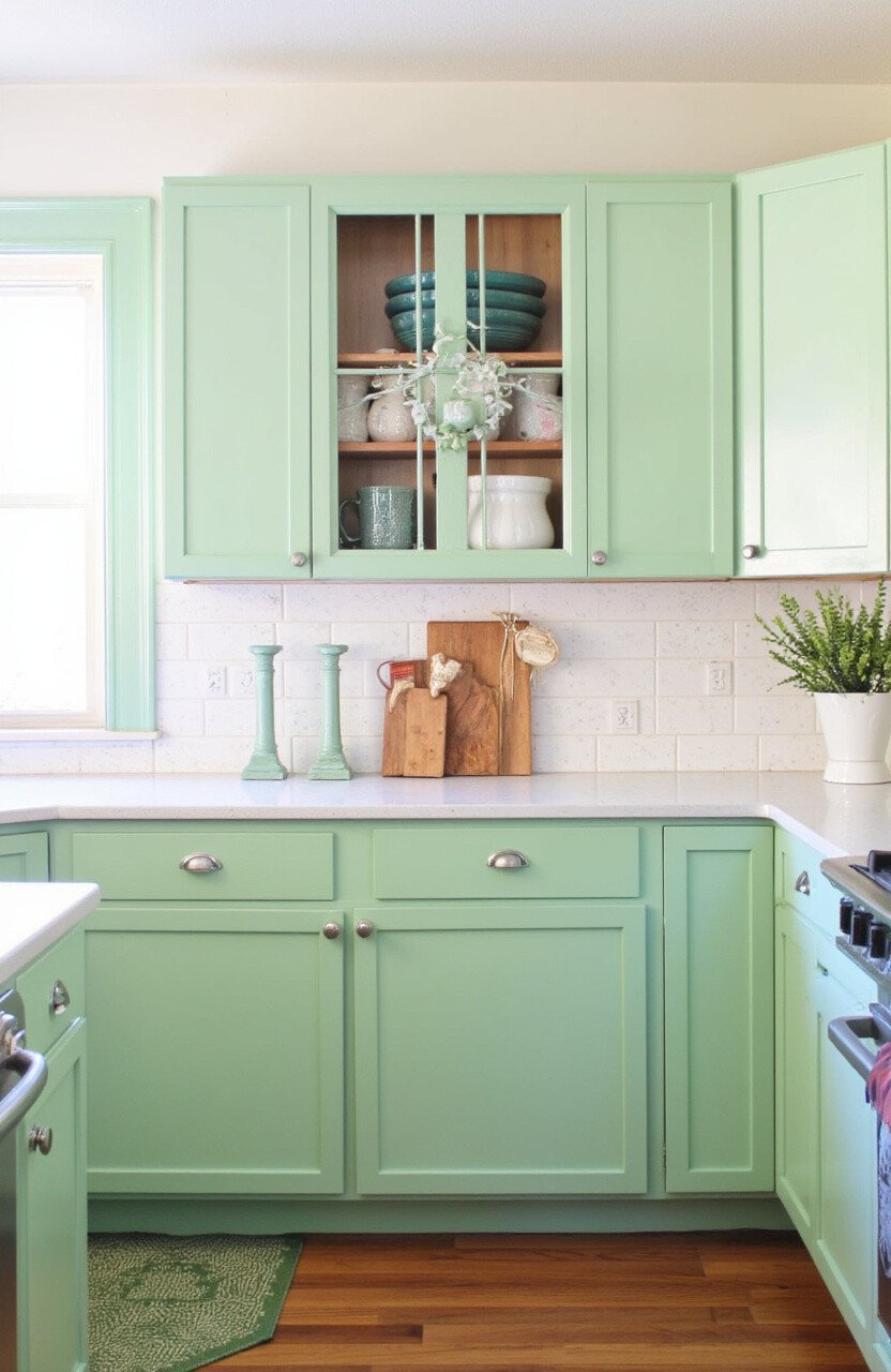 Bring life to your kitchen with dill green cabinets. This unexpected color choice can make your kitchen feel unique and stylish. It pairs beautifully with white countertops and rustic wooden elements.