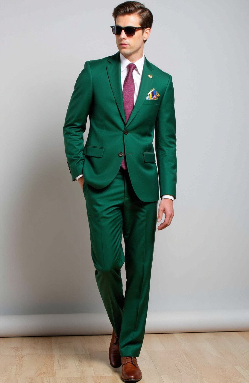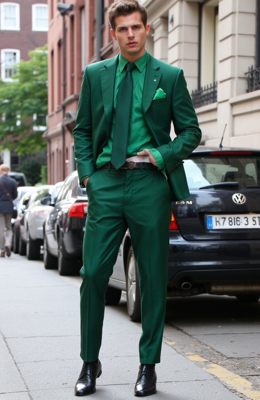 This look is great for parties or events where you want to stand out. It’s an affordable way to experiment with colors without fully committing to a bright suit. The key is to choose colors that complement the rich green tone.