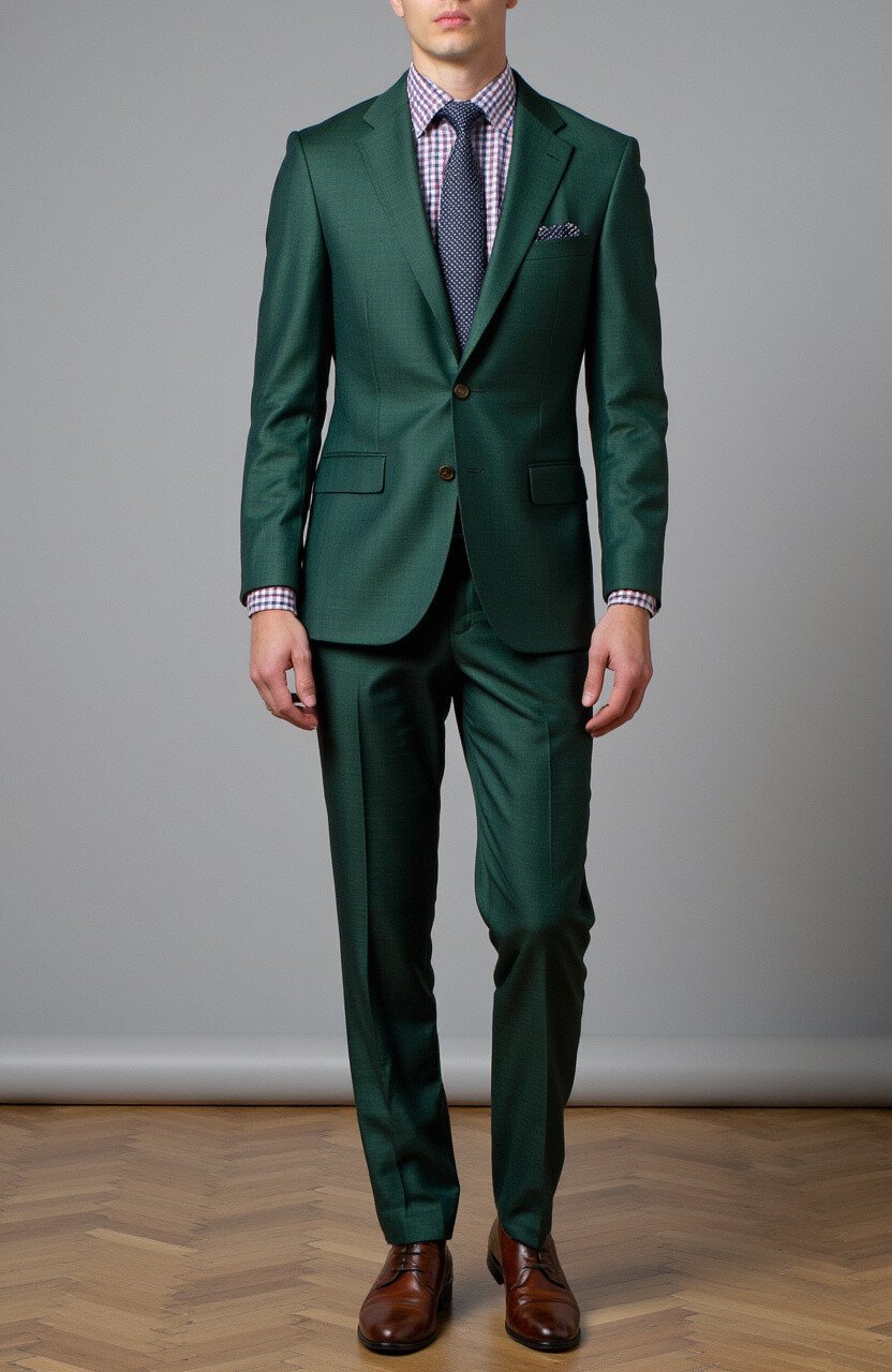 Why not add some pattern to your wardrobe with a forest green suit adorned with subtle checks or stripes? It’s perfect for those who want to add a little flair without going overboard. The pattern adds depth and interest to the suit.