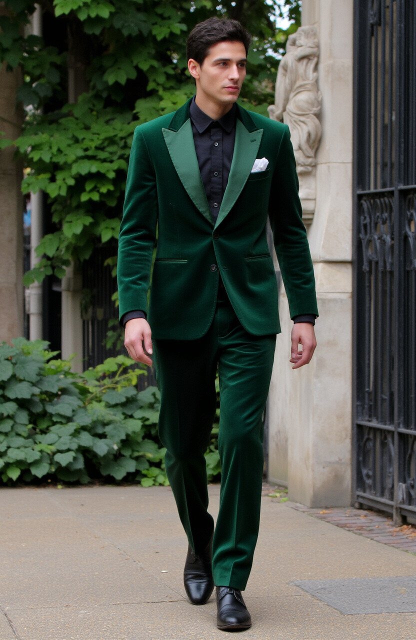 Velvet adds a luxurious touch to the already stunning forest green color. This suit is ideal for evening events where you want to shine. The soft texture of velvet paired with rich green tones is both opulent and inviting.
